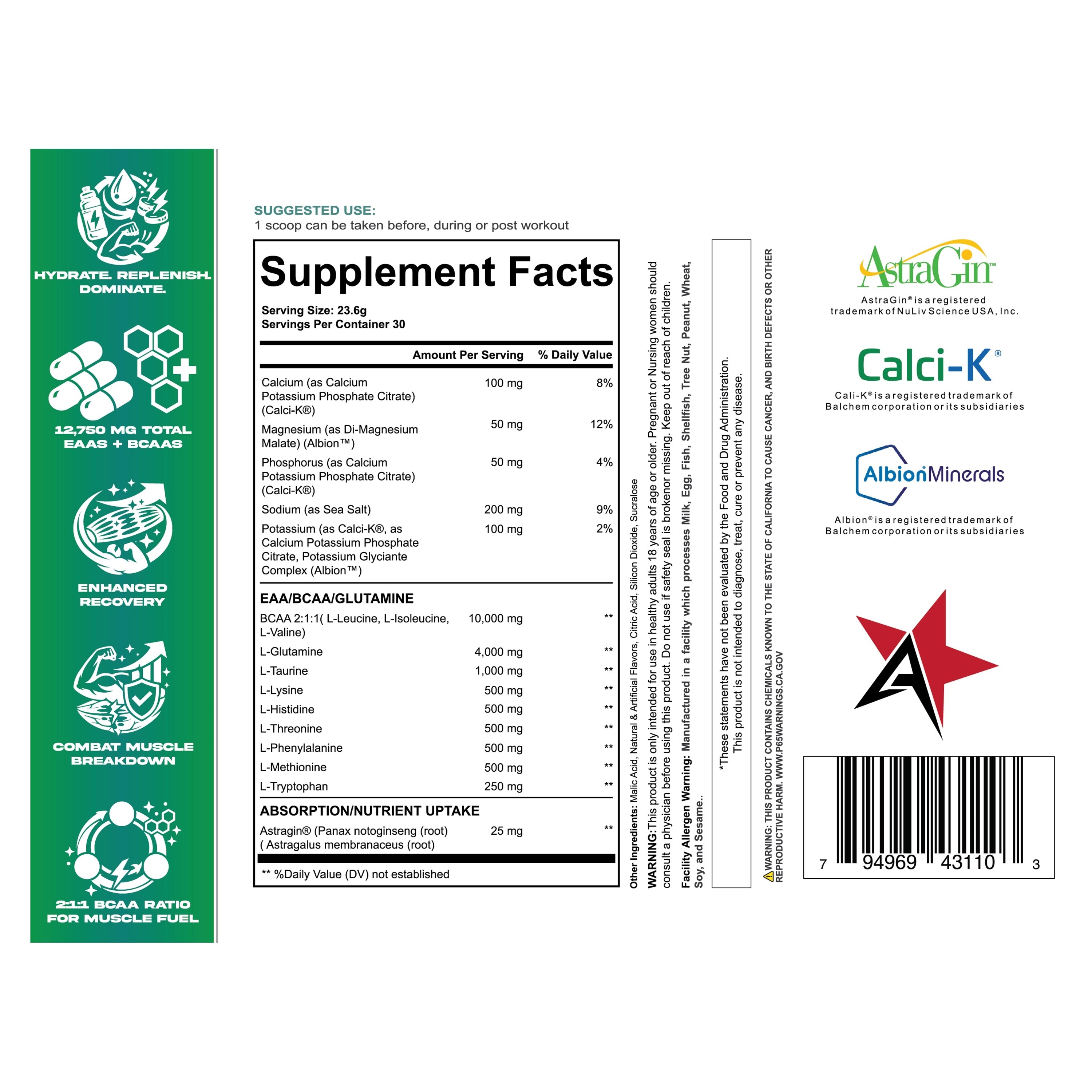 Premium EAA supplementation provides the essential amino acids the body needs to stimulate growth and preserve mass. For maximum effectiveness, this product features 12.7g of Essential Aminos and a powerful 4g of Glutamine per serving. Hydrate and replenish electrolytes, optimize recovery levels, and improve performance with this high-quality EAA supplement.